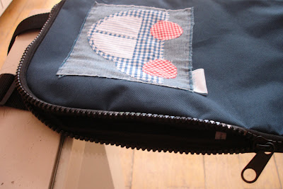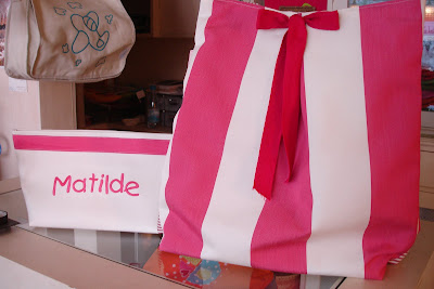 Saco grande em lona e tecido, com quatro bolsos exteriores (21,00) e bolsa de toilette em tecido com aplicação em feltro (12,00)